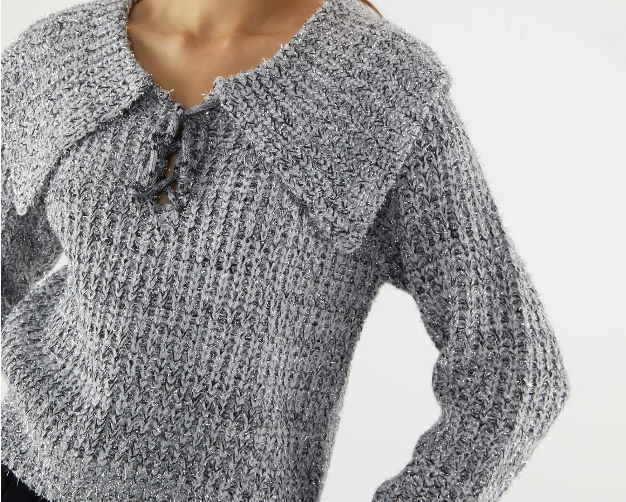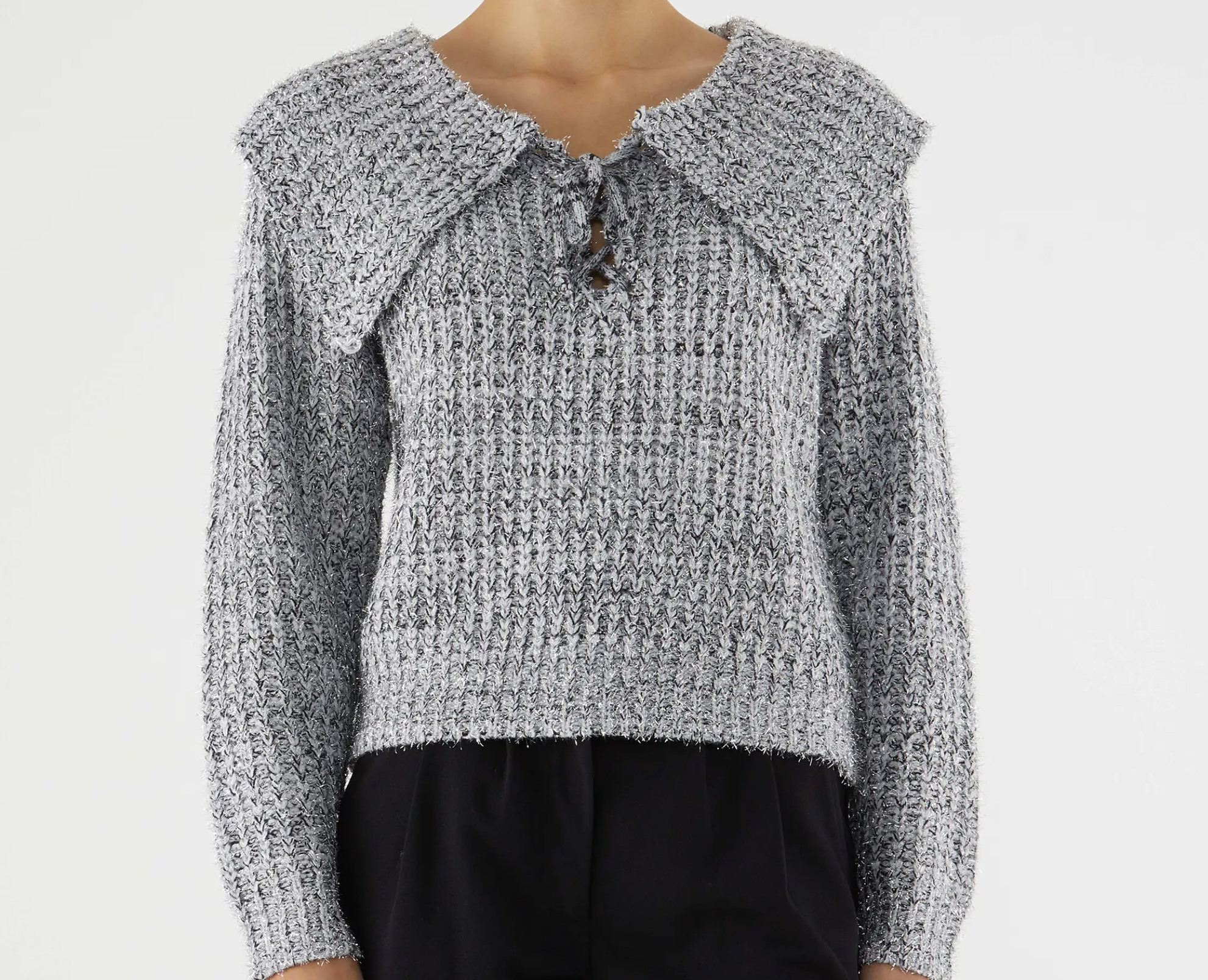 Compañia Fantástica, Donna, MaglioniMaglione grigio in maglia lucida. Con collo a revers e maniche lunghe. Chiusura del collo con coulisse. La modella è alta 178 cm e indossa la taglia S.