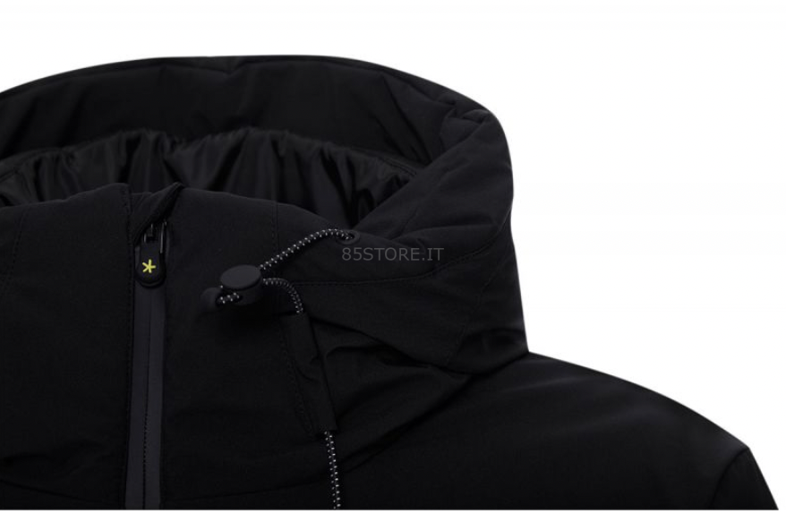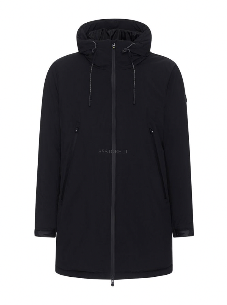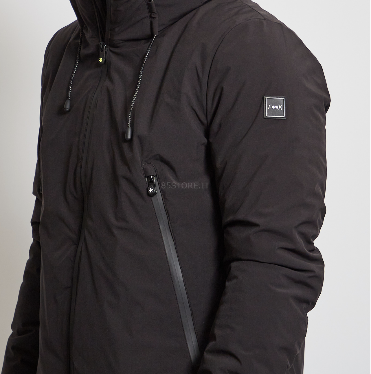 Brands, Cappotti e Giubbotti, F**k, UomoPiumino uomo collezione FW 21/22 del Mood Jardin. Capo in tessuto tecnico softshell idrorepellente e traspirante nero, modello lungo con cappuccio, dotato di doppio cursore sulla zip, tasche e logo F**K laterale.