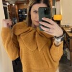 Maglione beige lavorato a maglia con filo di lurex. Con scollo tondo e manich a sbuffo. Particolare delle finiture in costina. La modella è alta 170 cm e indossa la taglia S.